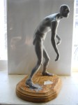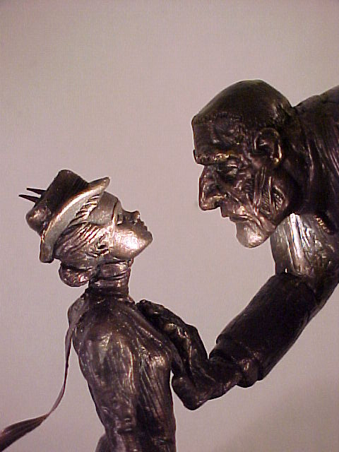 The scene depicted is from the second volume of LoEG, as Mr. Hyde is saying goodbye to Mina Murray, heroine of Dracula, before he confronts the Martians from War of the Worlds. Later in the story they mention a memorial statue will be built, and Serpentine Park will be renamed in honor of Mr. Hyde. I was trying to fit this into the narrative, suggesting this was the memorial statue (Ade Brown, the organizer of the charity auction, proposed the statue would have been sculpted by Mark Gatiss’s character Lucifer Box, and so Box’s signature is visible along with a date of 1900, two years after the events of the book).