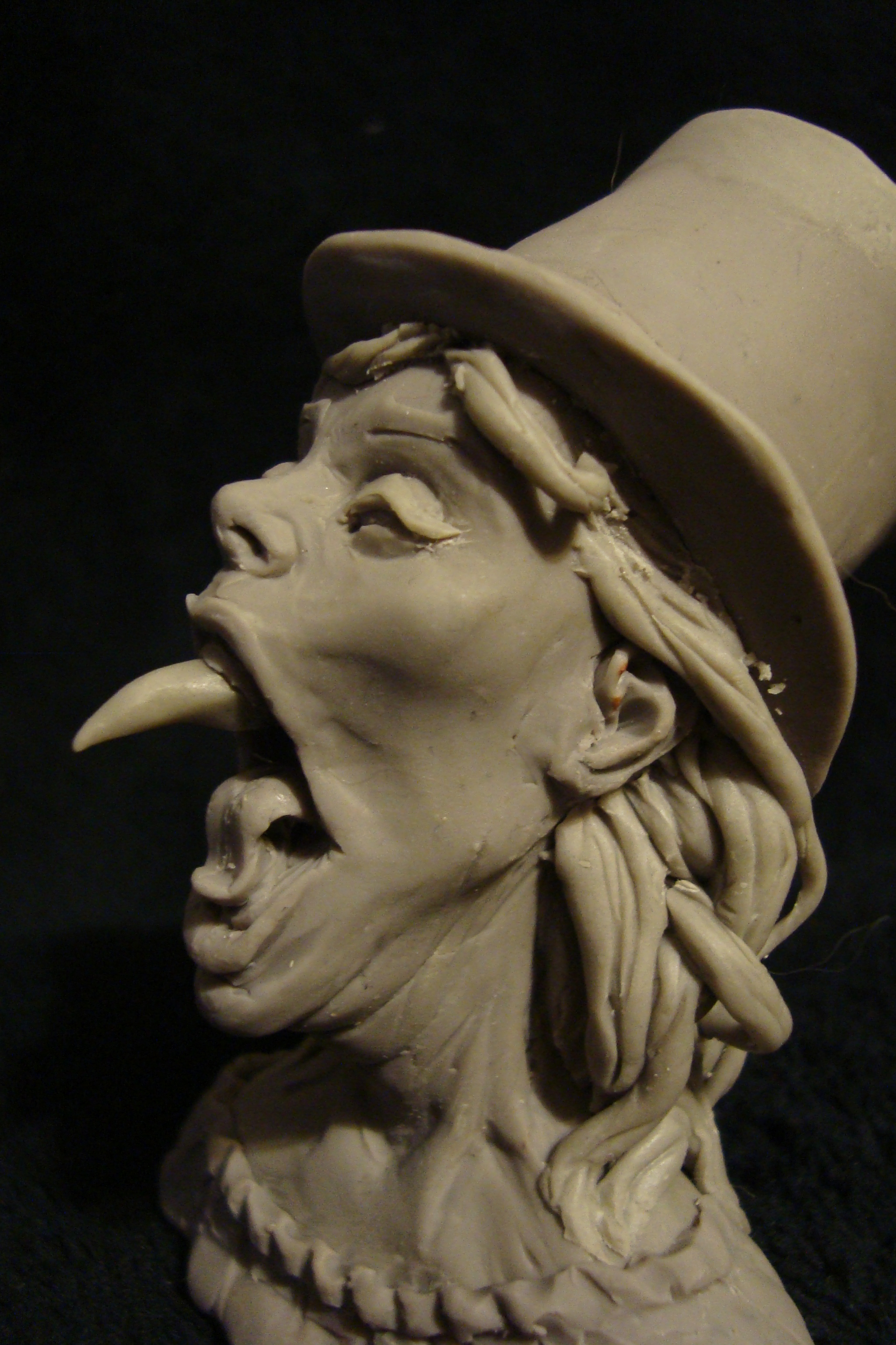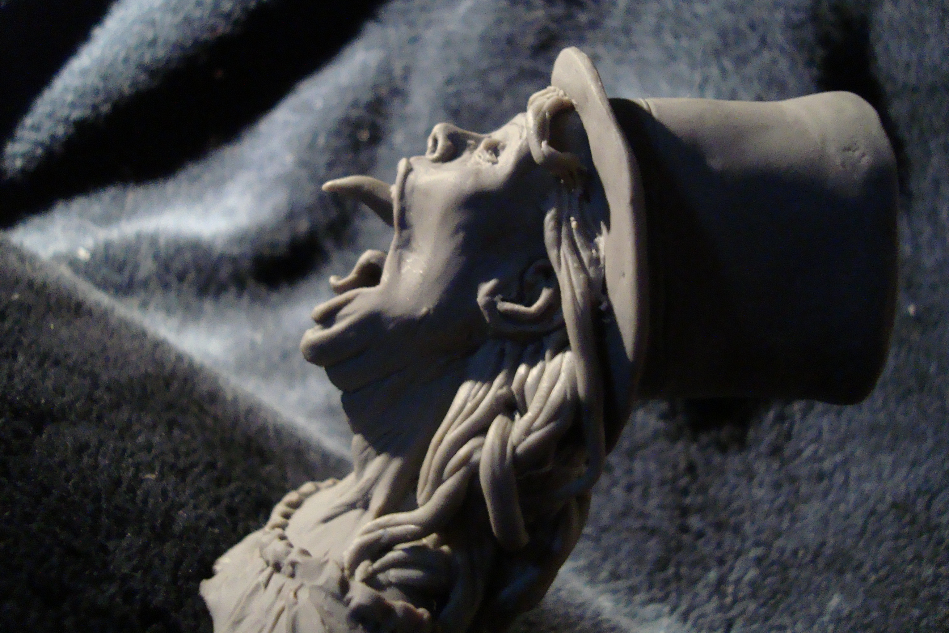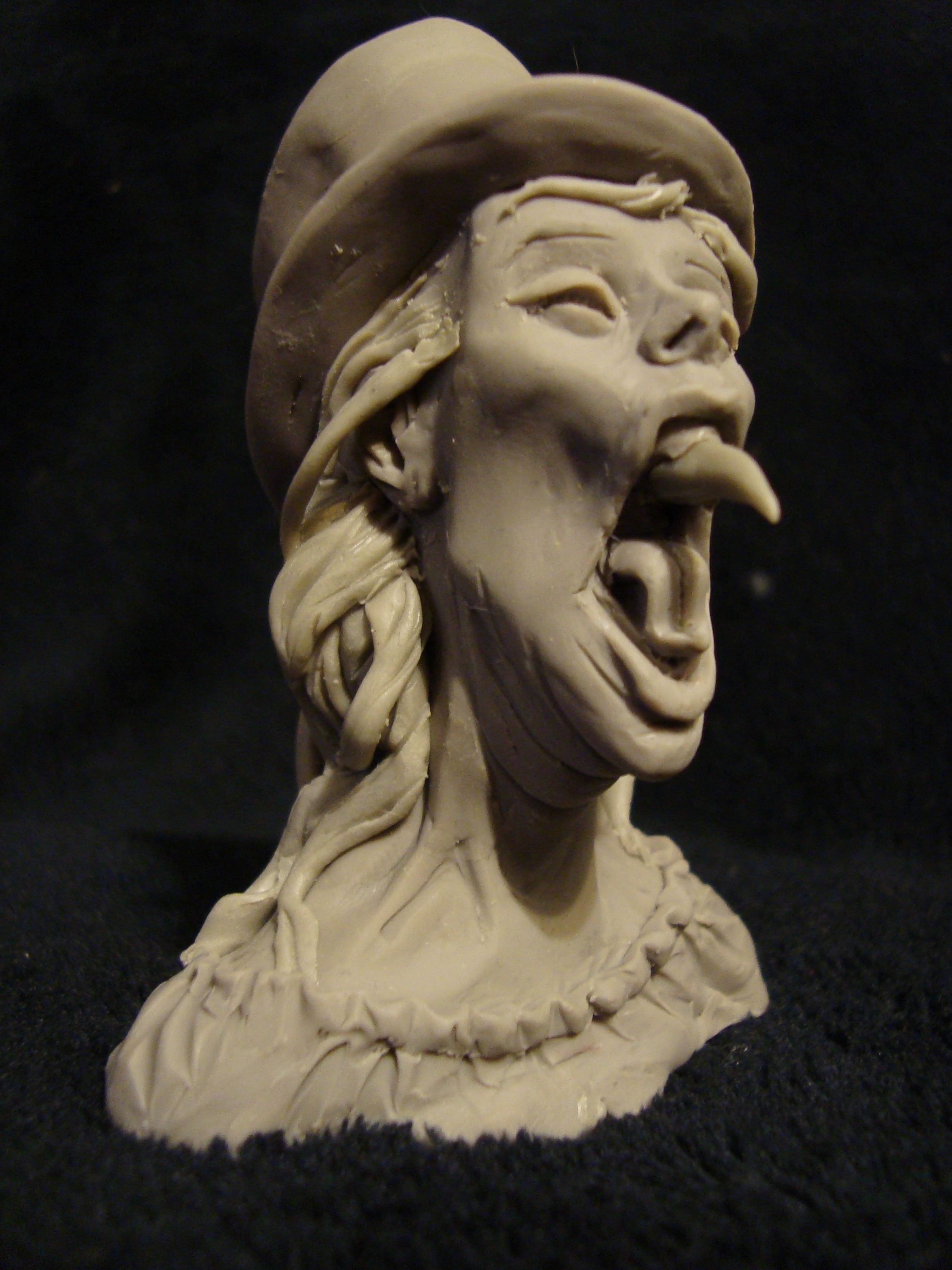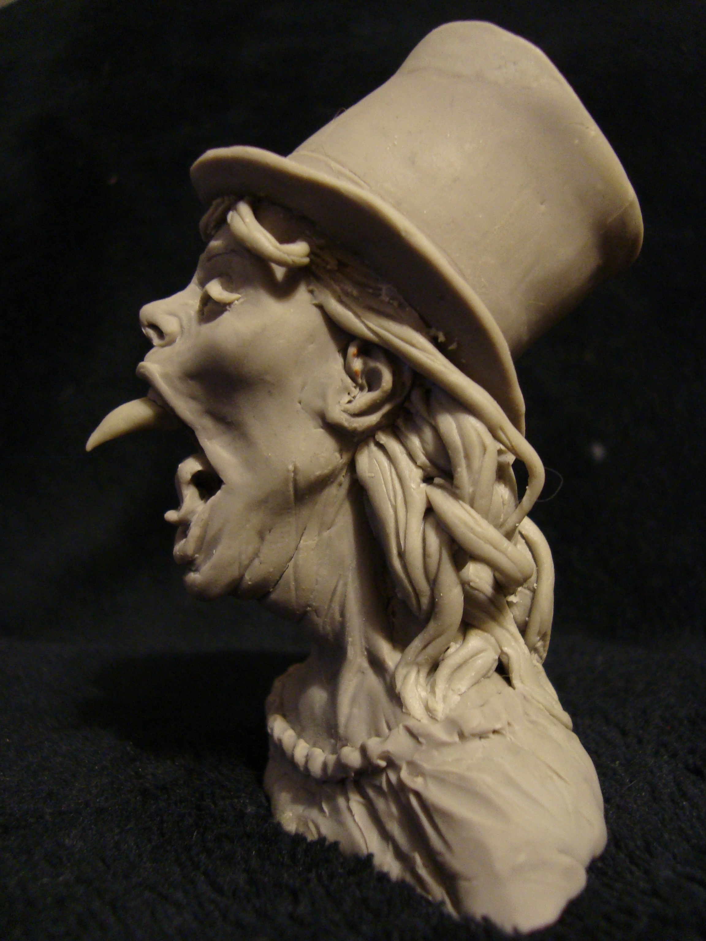 I made this mini-bust with a mixture of Super Sculpey, black and white Sculpey III and Sculpey Firm over an aluminum wire and foil armature. I also used a mixture of Super Sculpey and Apoxie, the recipe for which can be found here. This combination created a self-curing, water-thinned, more durable material that I used for the tooth and the hair loops, which would have been difficult with regular Super Sculpey. It’s a great material with the only downsides being a shortened working time and less self-adhesion.