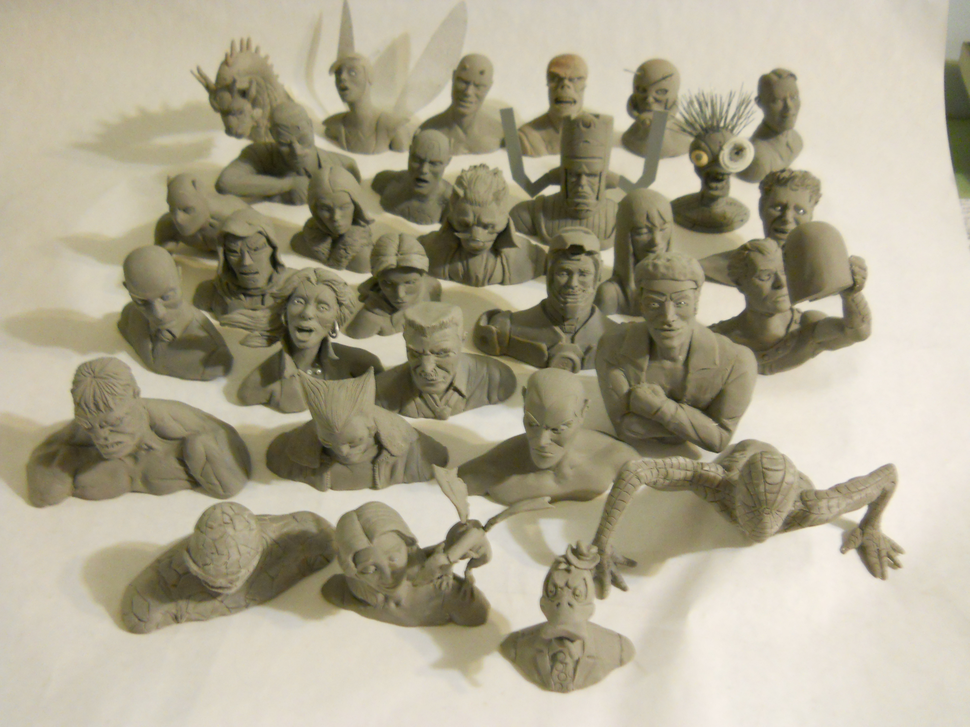 The sculpture was made with a mixture of Sculpey III, Sculpey Firm, and Apoxie over an aluminum armature. The original was molded in Smooth-On PMC (forgot which number) mold rubber and cast in Smooth-Cast 300, primed, painted with acrylics, and given a loincloth and crepe hair, set with clear fabric glue.